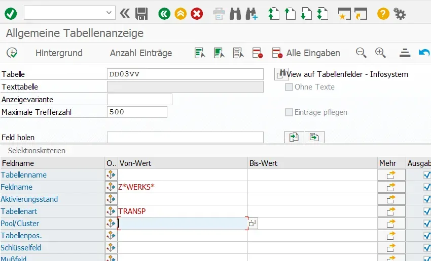 हाल ही में मुझे परियोजना में Z तालिकाओं का निर्धारण करना पड़ा है जिन्हें उत्पादक शुरुआत के लिए बनाए रखने की आवश्यकता है। अंततः, हम किसी भी प्रासंगिक तालिका को भूलना नहीं चाहते थे और इस प्रकार गो-लाइव के दौरान अनावश्यक अशांति पैदा करते थे। प्रासंगिक तालिकाओं को खोजते/पहचानते समय, मुझे निम्नलिखित डेटा दृश्य याद आया: DD03VV - तालिका फ़ील्ड का दृश्य - सूचना प्रणाली।