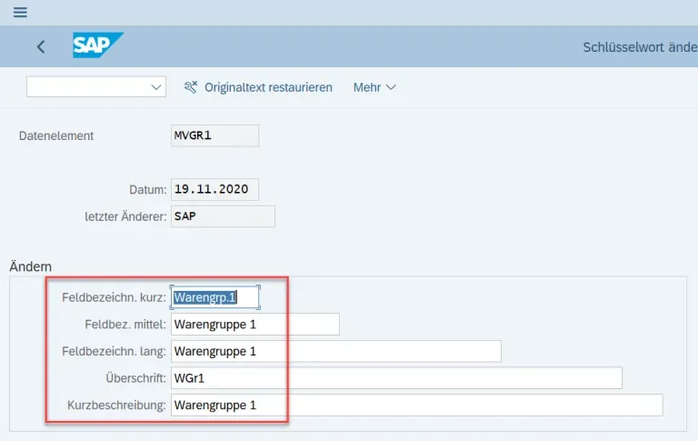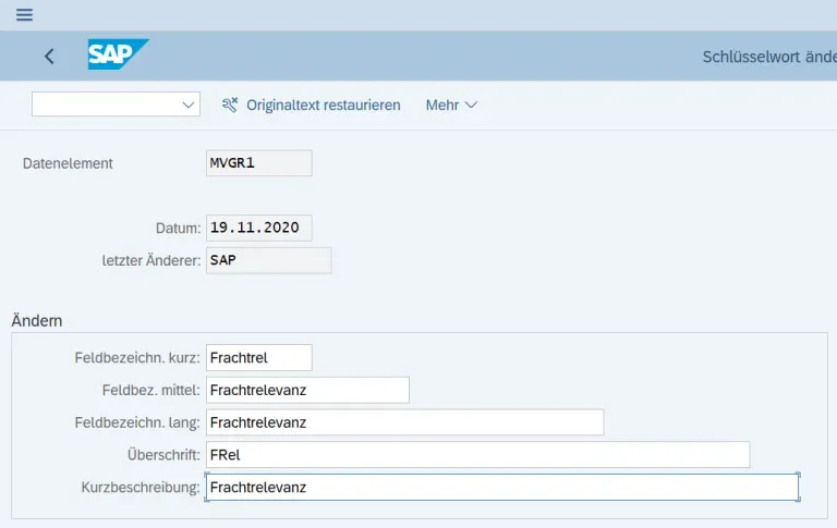 Doch diese Felder haben meistens generische Feldbezeichnung (Warengruppe1, 2, …), die dem User nichts sagen. Wenn man sich sich beispielsweise dafür entscheidet mit diesem Feld einen bestimmten betriebswirtschaftlichen Hintergrund abzubilden (bspw. Frachkostentrelevanz), dann macht es durchaus Sinn die Feldbezeichung entsprechend umzubennen: