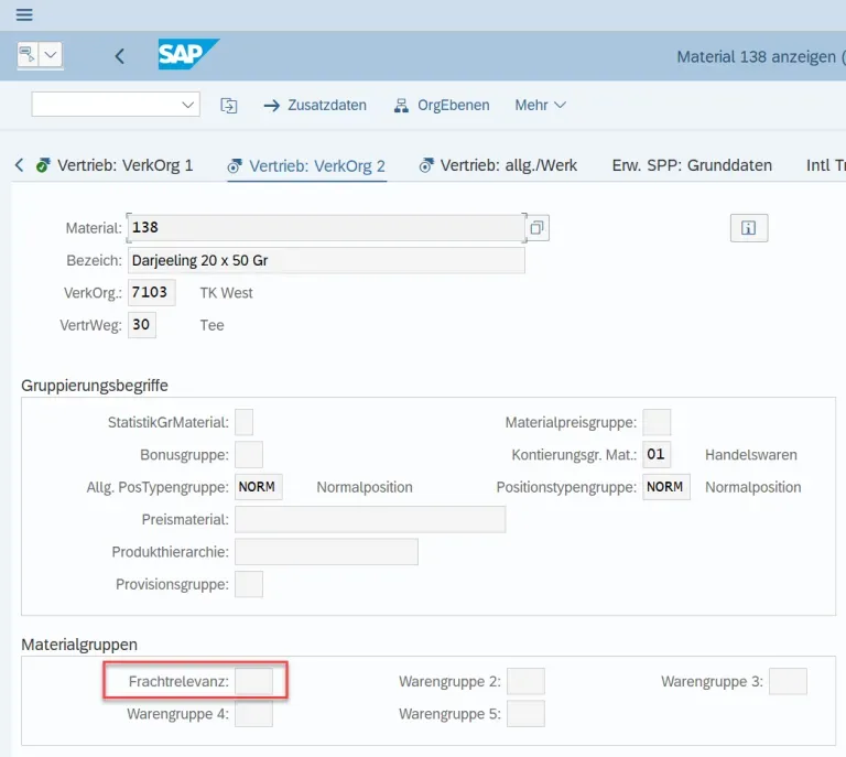 # Wenn man jetzt den Materialstamm aufruft, sieht dass das Feld nicht mehr Warengruppe1, sondern Frachtrelevanz: