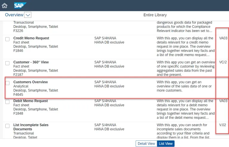 例如,您可以轻松查看所有 Fiori 应用程序进行销售,如下所示,甚至可以显示关联的 SAP GUI(交易):